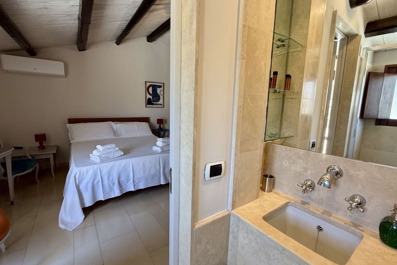 Una camera da letto matrimoniale con bagno privato en suite, moderno e funzionale